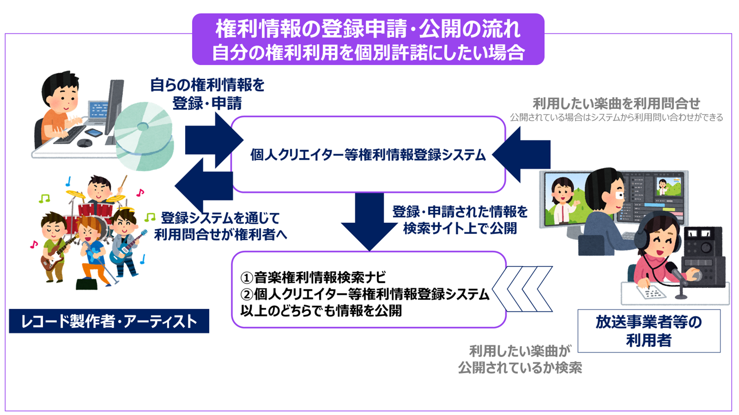 「個人クリエイター等権利情報登録システム」で登録した楽曲や権利の情報は、「⾳楽権利情報検索ナビ」の「利⽤問合せ楽曲」のタブ上で、及び「個人クリエイター等権利情報登録システム」で公開され、利⽤問合せフォームを通じて、利⽤者から当該楽曲に係る利⽤問合せが送られます。 個人クリエイター等権利情報登録システムはコチラ
